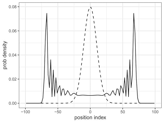 Quantum walk versus normal distributionThe classical random walk (dashed line) converges as mentioned to the normal distribution, while the quantum walk (solid line) has these strange peaks on either side and is actually quite low in the middle because of the interference. This is interesting because in traditional finance theory we’re always thinking about everything being normally distributed, so prices stay close to their starting point. But while this might be objectively fairly accurate, when you think about the mental frame of investors it’s quite different. Most people buying options on a stock aren’t thinking about that stock staying at almost the same price as it is now, instead they’re going to be thinking about it either increasing by a certain amount per year or decreasing by a certain amount per year kind. They might be biased towards one picture or the other but they’re also going to be holding the opposite picture in their head at the same time.