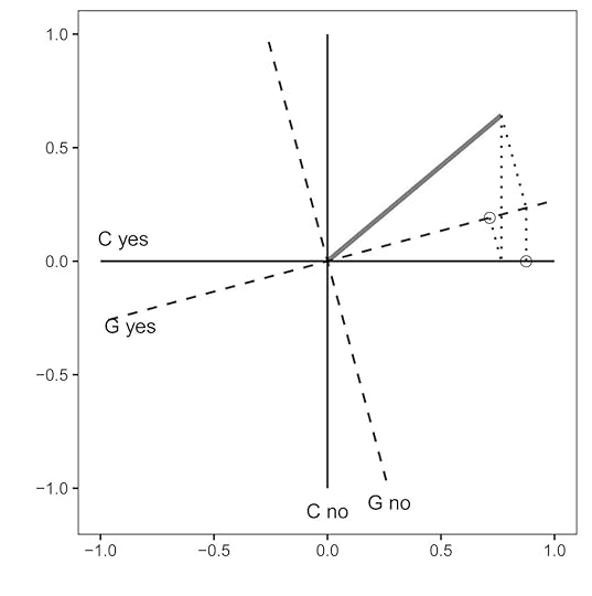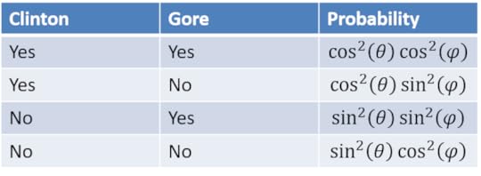of about 40 degrees so it’s roughly equally balanced in the Clinton axis for saying Yes or No. So let’s say that the response to the question is Yes, Clinton is trustworthy. Then that is then used as the starting point for the next question about Gore (dotted line) which gives one end point. But if the order of the question is reversed then you project first on to the Gore axis, and then onto the Clinton axis, and you get a different result. The reason is that there’s a kind of interference caused by the shift in the mental frame.