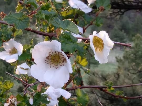 They’re almost finished flowering now, with just a few scattered flowers on the bushes, but a month or so ago the thimbleberry shrubs were thick with these fluttery pure-white blooms. There’s a large thimbleberry growing alongside our driveway between the house and the barn, and I admire these flowers multiple times a day in early summer.