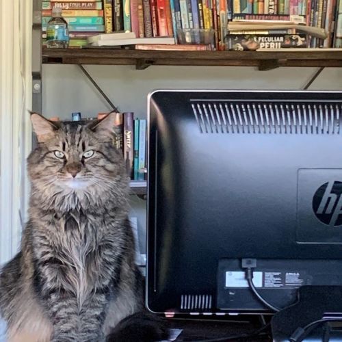 This is how Milton looks after he’s typed out a book on my laptop today. He’s enamored with my desk this morning.