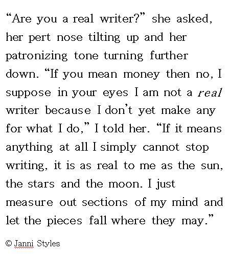 A real writer…what is this odd creature? For me, a real writer is a human who feels compelled to express her unique thoughts and ideas to a world of close ones as well as strangers…hoping someone somewhere will exclaim in delight. It really has nothing or little to do with acquiring money or fame. For me at least. Thanks, Janni Styles.