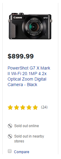 Demorei MESES pra achar essa porra de câmera aqui em Calgary. Por motivos que não entendo completamente, a G7X parecia permanentemente esgotada em todo território nacional canadense. Eu nunca vi nada esgotado tanto nas lojas físicas quanto nas online, e no entanto este era o caso.