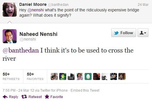 Vale um parêntese aqui. O prefeito de Calgary, Naheed Nenshi, é conhecido por suas trolladas no tuiter. Quando essa ponte foi inaugurada, a oposição espevitou a população contra seu líder, criticando o preço alto que os contribuintes pagaram pela construção. Numa dessas, o prefeito mandou essa resposta pra um crítico: