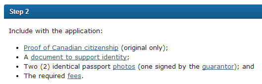 O Canadá pede pouca coisa, como se pode ver — basicamente, um documento que prove seu status de cidadão. Pode ser uma certidão de nascimento, que aqui é só um cartãozinho, ou um certificado de cidadania, que é o que eu tenho. Em seguida, pede-se também uma carteira de identidade que traga fotografia, já que os outros dois não a tem. Tradicionalmente se usa a carteria de motorista, que é aceita no país inteiro como documento único de identificação pra toda e qualquer função.