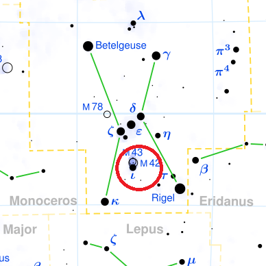A área que eu circulei de vermelho seria a “espada” de Orion, e nem com muita boa vontade eu consigo ver a arma branca aí. Talvez o favoritismo do nome seja porque Órion foi descoberta muitos séculos antes (a constelação já era conhecida nos tempos pre-históricos, aliás), mas como eu falei antes: maconha estragada é também uma boa teoria.