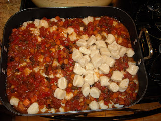 Adding boiled gnocchi to the pan with the chunky marinara...