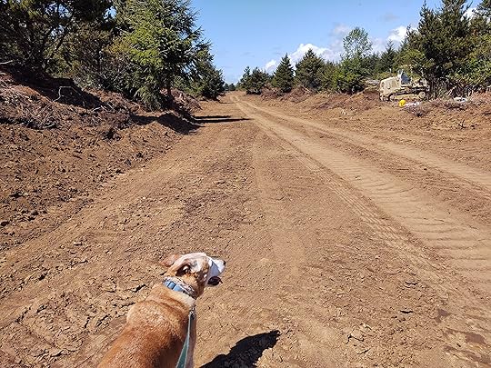 A month ago, this area in South Beach, Oregon was wilderness, for 25 years part of our daily walk. Things are changing. Annie the dog says, “Hey! What happened?”