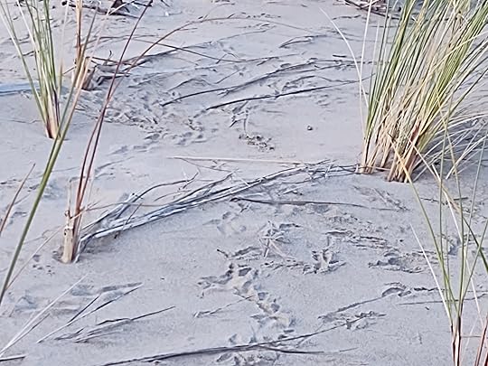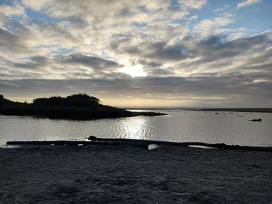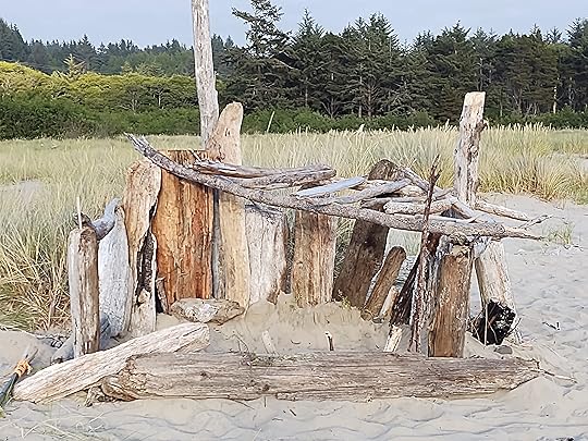 I went back to Ona Beach on a cloudy Wednesday evening. Except for a few teens wading in the creek, the beach was not crowded. Someone was sleeping in a car in the parking lot with paper bags in the windows bearing right-wing slogans. Another beach sleeper had left a well-built driftwood fort on the sand. But I had acres of sand to walk, planting my striped shoe prints among the footprints of gulls and scoters. As the memories flooded in, I wrote and took pictures, not noticing when the teens left. As the sun sank into the clouds, I was the only one on the beach.