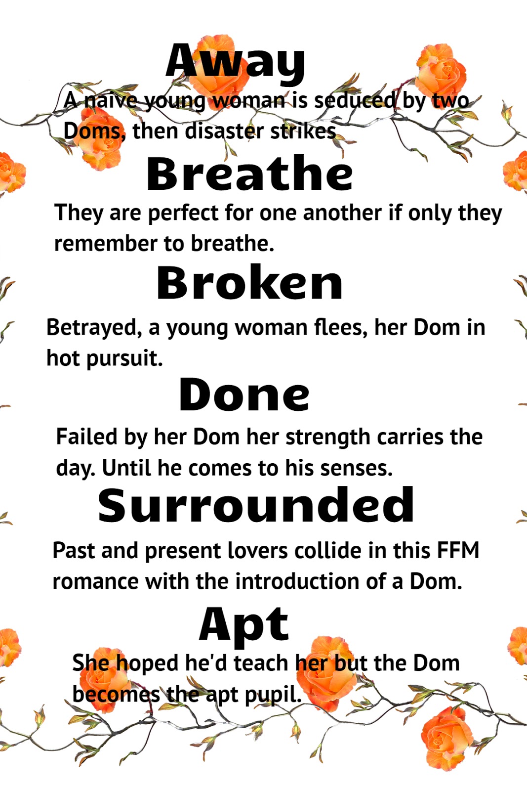 The Running to Lovecomplete series of 781 pages includes six previously released, rewritten, dominant romances- Away, Breathe, Broken, Done, Surrounded and Apt.
