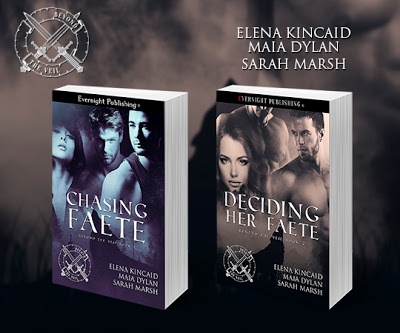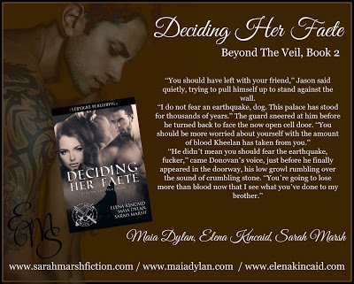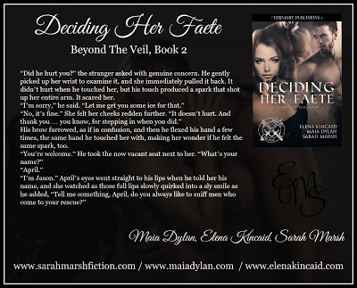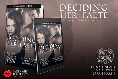 Deciding Her Faete Beyond the Veil, Book 2 By Elena Kincaid, Maia Dylan, and Sarah MarshPublisher:Evernight PublishingRelease Date: Aug 26, 2016Cover Artist: Jay AheerGenre:MFM paranormal romance The Beyond The Veil series started out as a fun exercise in our Sinfully More Erotic Street Team group and we’ve had such a great time writing them! So far, we have 5 books planned in the series, but I wouldn't be surprised if more sprout up along the way. All three of us fell in love with this mysterious world Beyond The Veil as well as our very overprotective Shifters on this side of the Veil.