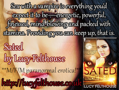 Blurb:A human, a vampire and a werewolf walked into a bar. Sexy is what happens next.Since getting together with her vampire boyfriend, Ace, Aneesa is enjoying a sex life she could never have with a human. Ace has skill, strength, stamina…and is massively adventurous. Aneesa is checking things off her sexual bucket list at a rate of knots. However, she hasn’t even come close to experiencing the ultimate item on her list. So when Ace beats her to it, proposing a threesome with his werewolf friend, Barton, Aneesa’s definitely up for it.Barton is attractive, smart and sexy—almost too good to be true, in fact. Aneesa decides not to jump straight into things, but makes sure it’s what she truly wants. However, it turns out Barton’s not so easily dissuaded.Will Aneesa get the ultimate erotic experience she’s desired for so long? Will she be truly sated, or is the plan doomed to failure?Buy links: http://lucyfelthouse.co.uk/published-works/sated/Add to Goodreads: https://www.goodreads.com/book/show/25950736-sated*****