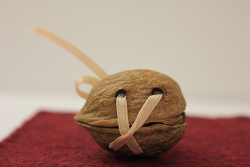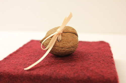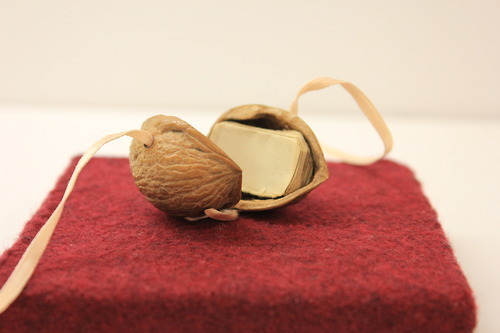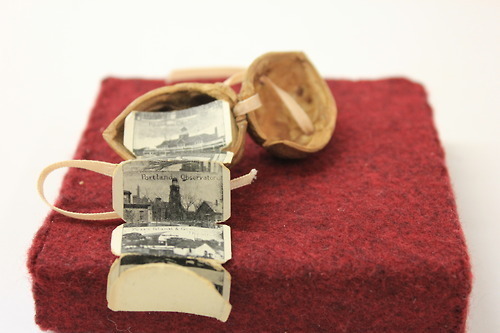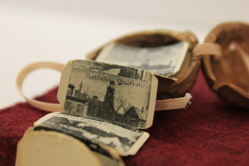 Check out this adorable, delicate little walnut book! Made from nothing but a walnut and a ribbon, the book opens to reveal an accordion of tiny photographs of Maine. It appears to be a souvenir or memory book from someone’s trip. A charming and mysterious miniature!