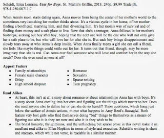 The second part contains 10 thematic book lists, each with 15 annotations that can be used not only as book descriptions, but as book talks. They also include read alikes and appeal factors for making connections between and among different books beyond those within the thematic list itself (in other words, while the book list might be about health and well-being, the appeal factors might hit on the fact the book has a great family element to it, making it connect with some of the books in the relationships book list). At the end of each of those thematic book lists is a long list of other books, too. Here's a sample of one of the annotations:
