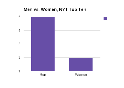 Starting on the very basic level, I counted up the number of different men and the number of different women who occupied a space within the NYT YA List. Because I wanted to cast the widest net possible from the beginning, I looked at not just the top ten list, but the extended list of 15.