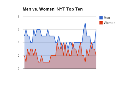 This is a week-by-week comparison of the number of men represented individually on the NYT List in blue against the number of women represented individually on the NYT list in red. Note that except for a few scant weeks in the middle of the chart -- that would be around May and June -- men appear more frequently on the list.