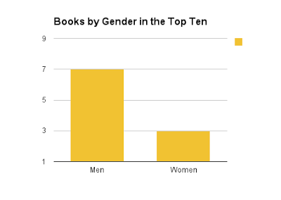 Because I looked at the data of individuals limited to the top ten list, I decided to do the same thing with the books. So the following charts look at gender representation in the top ten by books. Same deal: multiple books by the same author were gender coded multiple times.