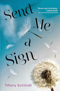 The hardcover edition of Tiffany Schmidt's Send Me a Sign is graphic and text driven -- it plays into the idea of superstitions, which is a big element of the book. Mia, the main character, believes in signs. To me, the cover has a small element of sadness to it. While it's bright, when you know what the book is about, the cover may suggest that there's not necessarily a happy ending to the story. It's a book about a girl diagnosed with cancer, and the white dandelion with its petals floating away may suggest death more than it does life. In many ways, the cover doesn't tell you a whole lot about the story, though I think it does look like a YA novel. The swirly font may play into that a little bit. Note that there is a blurb.