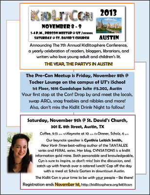 Have you been thinking about coming down to Austin for Kid Lit Con but haven't felt ready to commit? Now we have all of the details for this excellent, intimate, and more than worthwhile conference set -- and we extended the registration deadline until November 1.