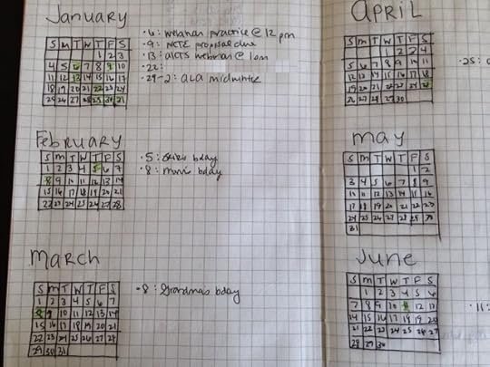 I began like the video does, by numbering my pages and creating an index at the front of the journal. This method lasted for approximately 15 pages and two days of January. I don't care about being that organized. If I do, I can go back later and fill in those gaps. I did end up making a yearly calendar at the beginning of the journal, month by month, with key dates highlighted and marked. I haven't referred back to this much since creating it, so it's stayed blank. I'd probably ditch this in future iterations.