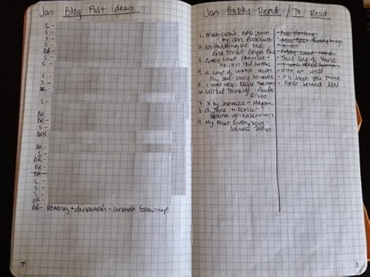 Following those three key pages, I then flip to the following page for a two-page spread which becomes a place where I keep track of two things during the month: blog post ideas, as well as books I've read and books I'd like to read that month. I don't get to everything on the "to read" list, but that's become a way for me to keep up with what I've been thinking about or wanting to read so when I do finish something and wonder what next, I have a place to turn.