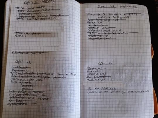 Generally, I write out a week of dates at a time. Sometimes I'll go further. I don't usually put the day of the week beside the date, but I have done that to keep track periodically. What's been key for me here is this: I list things I need to do, or a memory cue for them (like "Pinterest" and "Goodreads," which are things I do for Book Riot) and I mark them off as I accomplish them. When I see there are things being unmarked and unaccomplished, I move them to the next day.