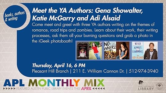 I don't do a whole lot of programming in my current position, but I'm happy to say that I'll be bringing three YA authors to my library next week while they're in town for TLA. If you're in town too, won't you consider stopping by? We can say hi and you can watch me moderate a fun panel on writing for teens with three talented authors. There will be discussion, open Q&A, signings, giveaways, and you can even snap a photo of yourself and the authors in our iGeek photobooth.