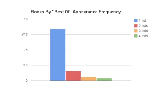 Another worthy element to consider, which I haven't here but could if I were to dig up all of my original spreadsheets, is whether there are authors who are perennial favorites. I have a suspicion, for example, that Maggie Stiefvater and A. S. King are two authors who have appeared every year on these lists (in fact, I know that they have!). Anyone who is up for the challenge of ferreting that out is more than welcome to do so, and I'd be happy to include that work in a link round-up feature here.