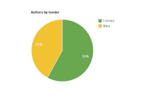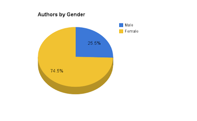 In 2014, the break down was roughly 70% female authors and 30% male authors.