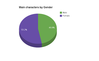 When it comes to the gender of main characters, comparison is a little tricky, since I haven't been consistent about keeping track of that. I covered it in 2013 for the first time, but I didn't create a catch all category of "cast of characters" until this year. So this data is imperfect by nature, but I'm going to share it, since it's interesting nonetheless.