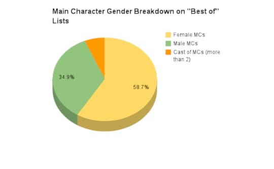 2014 had more female voices than male voices represented, but with the cast of characters as a third factor, the representation isn't hugely different. Again, despite having more female authors on the "best of" lists, the difference in male voices in the books against female voices in the books remains not hugely different. There are plenty of books featuring male main characters and they're earning recognition.