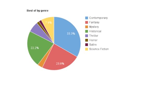 The first stab I took at genre was in 2011, wherein for some reason I thought it was valuable to separate thrillers from mysteries. There weren't as many genre-braided titles in this year, though as it shows, contemporary/realistic titles had the most representation, followed closely by fantasy, historical fiction, and then mysteries/thrillers, and science fiction.