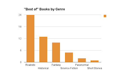 Maybe the most interesting thing about this data is how science fiction hasn't been a leading genre in the "best of" lists. In fact, it's fallen a bit -- are we not seeing science fiction among the "best" anymore? Has there been a drop in the number of science fiction titles being published? Are science fiction books more likely part of a series and thus not always easy to put on "best" lists? There are more questions than answers, but I want to know more about what's happening with science fiction in YA.