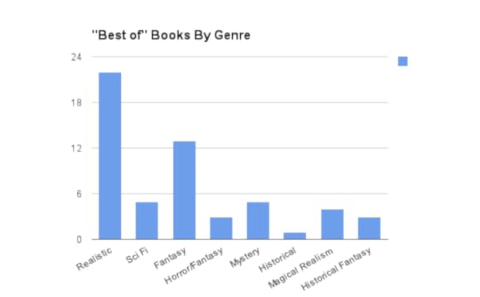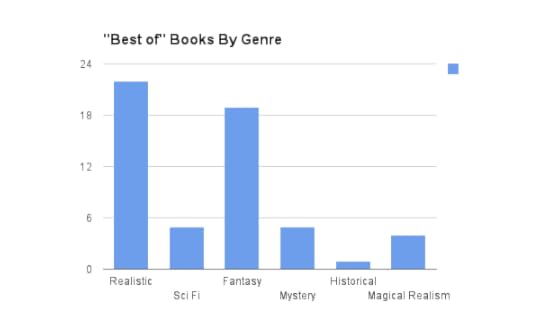 Even when the subgenres of fantasy were collapsed, realistic fiction still held the most "best of" spots in 2014. Fantasy wasn't far behind. But most interesting is that historical fiction is nearly non-existent in 2014 on the lists -- more books were historical fantasy than actual historical fiction. This year also ushered in more titles that were magical realism, as that was a subgenre/blending of genres not seen in previous years.