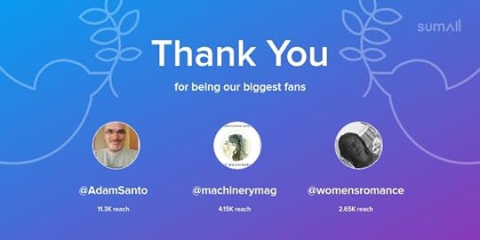 Our biggest fans this week: @AdamSanto, @machinerymag, @womensromance. Thank you! via https://t.co/KsqGak5qFj https://t.co/iBriWJDyuH