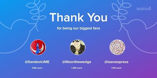 Our biggest fans this week: @SandoviciME, @lifeonthewedge, @isarosepress. Thank you! via https://sumall.com/thankyou?utm_source=twitter&utm_medium=publishing&utm_campaign=thank_you_tweet&utm_content=text_and_media&utm_term=23ed86f611cccca4a0bc28d9