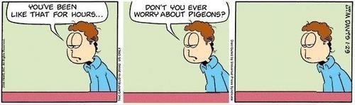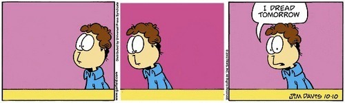 Why is this so common? Maybe it has to do with that old canard, “It’s funny because it’s true.” Surely we aren’t Jon Arbuckle, are we? Look at that potato shaped head, the huge bug eyes. He can’t be us, yet paradoxically that allows him to be exactly like us, because otherwise it would be too close for comfort. We laugh because it’s ridiculous, and the ridiculousness frees us laugh because it’s true.