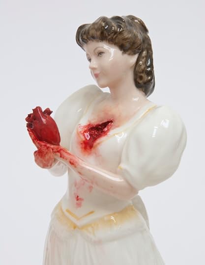 Horror can often be heightened when juxtaposed with the wholesome and innocent. That’s one of the reasons why toys and children in horror movies can be particularly terrifying. That’s what makes these figurines by Jessica Harrison so disturbing. Traditionally such pastoral figures are soothing, safe. By subverting that with gore (the heart here…other images include the brain, intestines, and even the face) the corrupted image shows us that we are not safe, and that what soothed us is a mirage. Interestingly, it is at least implied that the women portrayed mutilated themselves. They are not innocent victims, but rather perverse actors. Very creepy.