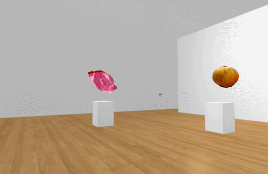 This is the entrance to a browser-based 3D art gallery. While the street you begin on consists of detailed high-rise buildings—across the street is a restaurant, and next to it a brick building appears to have flowers painted on it—the interior of the gallery itself is, much like physical art galleries, comprised of off-white walls, wooden floors, and black labels, leaving color the exclusive domain of the pixel art pieces themselves. A two-dimensional red piece of meat is elevated in the center of a room like a statue. In another room, abstract designs in blues, purples, and greens decorate the wall, like modern art meeting pop art.