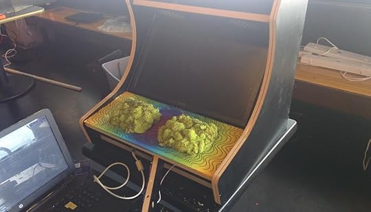 This is really happening. Right now, at Fantastic Arcade, Alea is being played on an arcade cabinet. You have to poke all four fingers on each hand through two of the springy, soft lichens to get at the buttons underneath. You dip into nature first before connecting to the electronic media beneath. What a bizarre and delightful way to play a game. (I bet that moss will get warm, though.) The idea was net artist Cale Bradbury's, who was inspired by the insectoid typewriters in David Cronenberg's Naked Lunch.