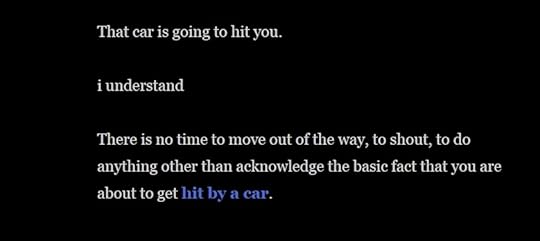 But there's a lot more to the game than that. This is about being hit by a car, right? Yes, eventually, you will get struck. The difficulty ramps up to the point that this becomes inevitable. At this moment, the game suddenly crashes into a corrupted smear of colors while a loud computer error blasts. This lasts only half a second but immediately jolts you out of the vibrant pleasure you were experiencing, and back into the black screen. The text returns.