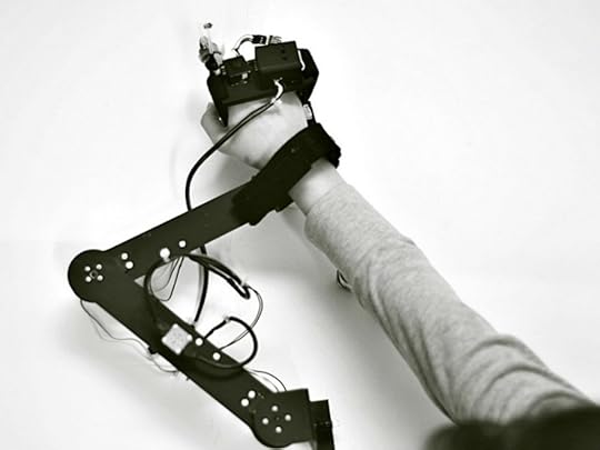 Although clearly rudimentary at this stage (apparently built in a week), Datta's contraptions are an interesting glimpse into our possible future robot-assisted lives. This little experiment raises some interesting questions around the future of learning and design practice. Does robot-empowered repetition lead to real learning? What does this mean for the un-robotically enhanced? What do we lose (a lot I would suggest) when we disconnect the training of our appendages from the application of the mind?