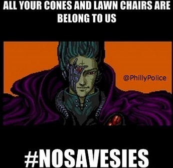In 2003, seven young men were arrested by police in Sturgis, Michigan for posting signs of the now-ubiquitous videogame meme, “All your base are belong to us,” all across town. At the time, local residents interpreted the prank in light of the wars in Iraq and Afghanistan, with the Sturgis Police Chief calling it a “borderline terrorist threat.” Now, over a decade later, police in Philadelphia are using the same Zero Wing (mis)translation as part of their “#NoSavesies” social media campaign to stop people from getting in fights over parking spots that don’t belong to them.