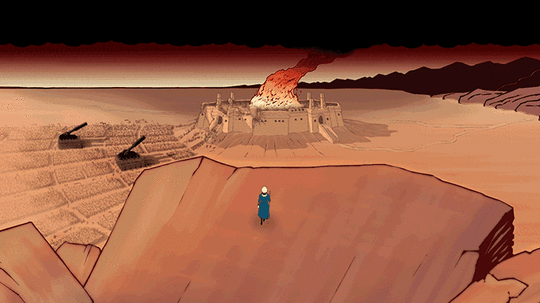 According to its Kickstarter campaign, the first seed of what would become Tahira: Echoes of the Astral Empire was the game’s emblematic image: a woman in blue looks down at her red, burning city. There’s a paucity of details that add to the drama; the mountains are uniformly dark, while the desert is boundless and bare. Both are supported by the game’s plain, unsophisticated aesthetic, charmingly complete with rotoscope animation. All of the above combine to create an interesting drama out of drabness: two splashes of color set against a dun disaster.