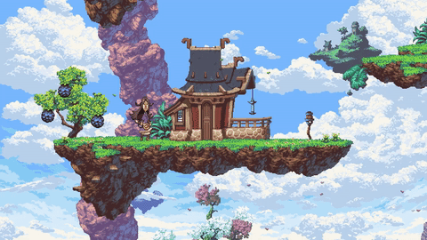 This commitment is rooted in the game’s inception back in 2007, which was to showcase the advantage of 2D art over 3D—this was before the more recent renaissance of pixel-art titles, like Superbrothers: Sword & Sworcery EP (2011) and Hotline Miami (2012). Back in 2007, Andersen saw the arrival of Nintendo’s Wii as changing videogames forever more, and with it was pushed the idea that pixel art was more outdated than ever. His response was to create “a title that could showcase the medium’s strengths.” He first looked to spin his ambition off the Kid Icarus series, mostly due to rumors back then of a 3D version that was supposedly on its way, but “none of the concepts for indoor flight seemed to translate well to 3D,” according to Andersen. He saw in this an opportunity to show how 2D art was a better fit for that type of game. The concept then grew further while Andersen was playing Super Mario Bros. 3 (1988) around that time. The Racoon Suit gives Mario the ability to descend slowly after a jump, and Andersen thought about the potential in pressing the button again to fly. “I imagined you could fly pretty high, maybe find floating islands,” he said. “Those islands would be so removed from society you might not be able to understand their language.”