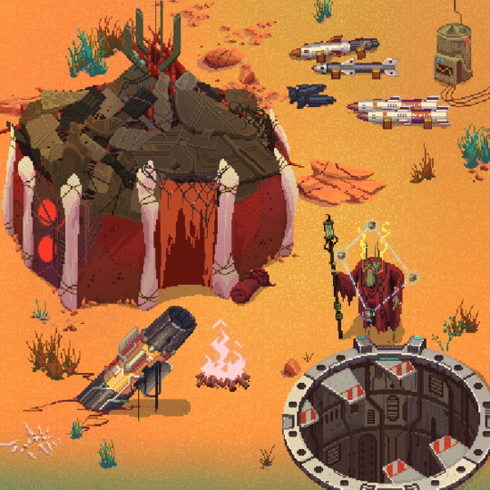The hook here is that various wildly different versions of Earth in this world have suddenly been brought together into one planet, pushing beings from different universes who were never meant to live together into proximity and forcing them to coexist. These aren’t just other versions of humans either—the beings from the other Earths run the full gamut of bizarre, from Ralph McQuarrie to H.R. Giger. Looking at the game’s website, there’s a zen monk alien, a living sarcophagus, a tubby bird man wrapped in a red cloak, and some sort of skeletal deer/tree hybrid, just to name a few. All of this is expressed through detailed, highly-animated pixel art that plays homage to classic ’90s RPGs like Shadowrun, and is set alongside rust-colored post-apocalyptic deserts that call back to Mad Max. It is a world tailor made to facilitate the artists’ imaginations.
