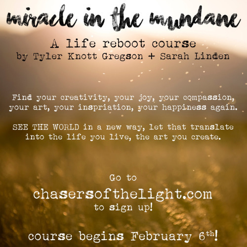 ChasersOfTheLight.com! It’s here! Our Life Rebooting, creativity finding, passion building, two week online course on finding Your joy taught by yours truly and the lovely @SarahLinden . We’ve been talking about doing a course like this, a Not-writing exclusive course that is based around Life and Inspiration based questions you lovely people have been asking me for years, for a long time, and we finally just stopped talking and started Doing, and we’re opening the doors for registration NOW! Miracle in the Mundane: A Life Reboot is what we came up with and we are Thrilled to bring it to you! For all you that sign up, you can expect daily challenges and prompts, inspirations, guided meditations, access to a closed Facebook group and community, and Live Check-ins and Live Q&A sessions after the 14 days are up! Plus, for the first time EVER and for Members ONLY: We’re going to be doing IN-PERSON MEET-UPS all over the world when we travel. We can meet, hug, write, read, discuss, answer questions, sign books, and whatever else you crazy folk want to get up to! Right now, we’re offering the course at an Early Bird Pricing, so head to ChasersOfTheLight.com to watch the video, scroll down and Register to join us! The Course Begins officially February 6th, so you have plenty of time to brace yourself for a reboot and a positive leap into the rest of your life. We so hope you’ll join us, we so hope you’ll take this leap with us. ChasersOfTheLight.com