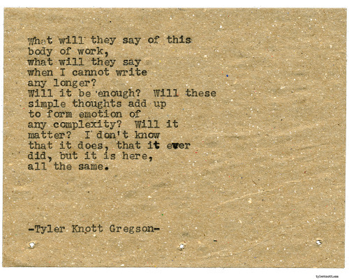 Howdy wacky tobaccys. A time ago, this was Typewriter Series #499. I think of things like this so often it’s bizarre. I wonder of our interconnectedness, of our ripples, of the impacts we have spreading out infinitely and enveloping all those we allow near. What a beautiful world, seven billion knots connecting seven billion souls, all of us dancing together, every time we laugh.