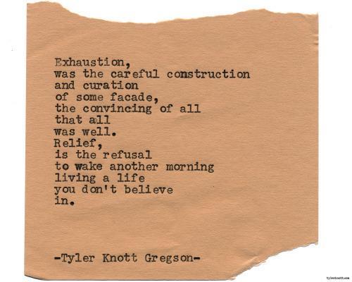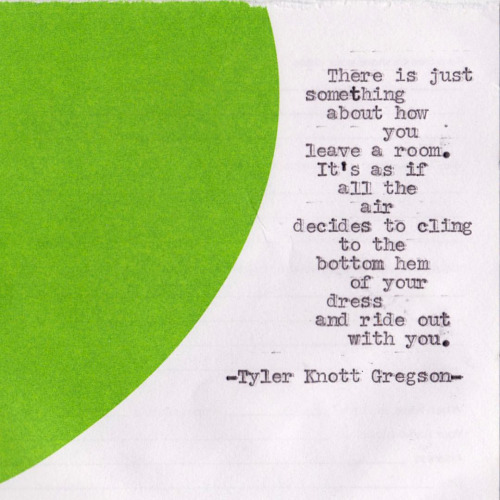 Hi. I am Tyler Knott Gregson. I am a Cancer. I enjoy tea and long walks on the beach. And whales and bumblebees. But not milk. Or garlic because I am allergic. I laugh a lot. I cry a lot. I think kindness is underrated. Sometimes my brain won’t shut up. I would be rubbish at writing a personals ad, that’s for sure, but this Was Typewriter Series #115 some years ago. Yep.