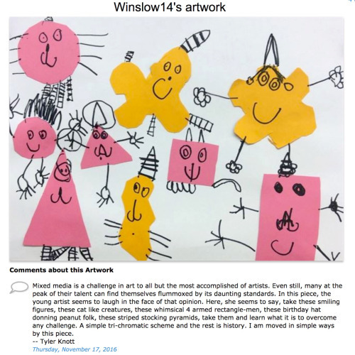 New favorite hobby: Leaving real art critiques on my 5-year-old niece Winslow’s online art gallery works. More to come. :)