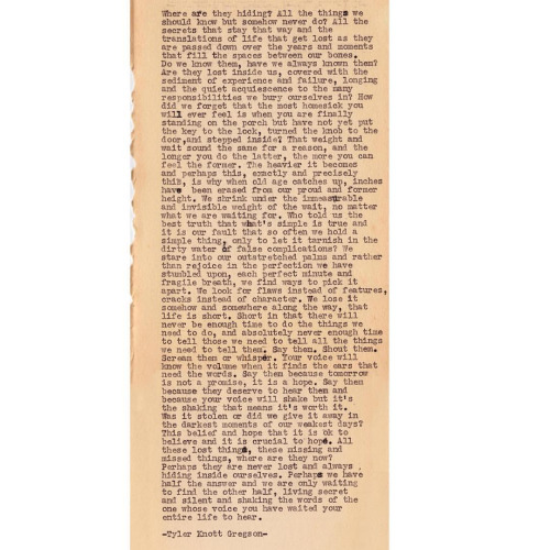 do the things we need to do, and absolutely never enough time to tell those we need to tell all the things we need to tell them. Say them. Shout them. Scream them or whisper. Your voice will know the volume when it finds the ears that need the words. Say them because tomorrow is not a promise, it is a hope. Say them because they deserve to hear them and say them because your voice will shake but it’s the shaking that means it’s worth it.